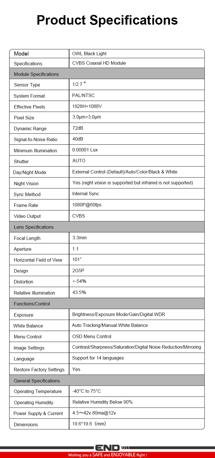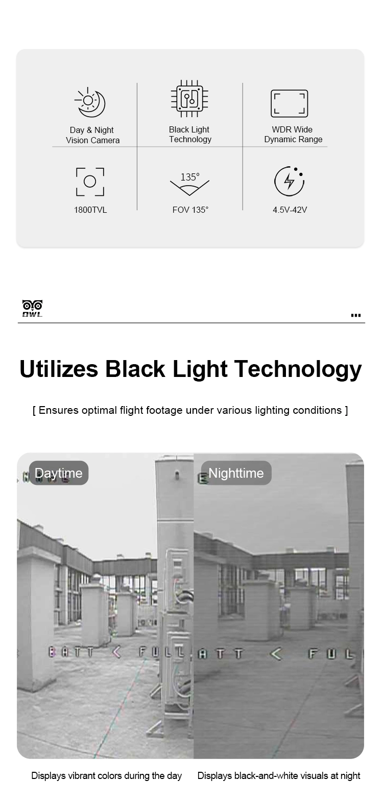 كاميرا FPV من نوع Axisflying OWL Black Light CVBS Coaxial HD Module هي كاميرا FPV تعمل بالرؤية النهارية &والليلية تستخدم تقنية الضوء الأسود لتقديم صور واضحة في ظروف الإضاءة المتنوعة. تدعم مخرجات PAL/NTSC CVBS، ونطاق ديناميكي واسع (WDR)، وزاوية رؤية 135°، وتعمل من 4.5V–42V، مما يجعلها مناسبة لأنظمة FPV التناظرية.