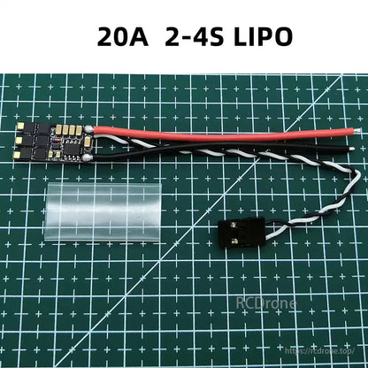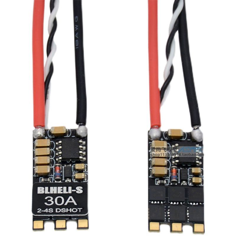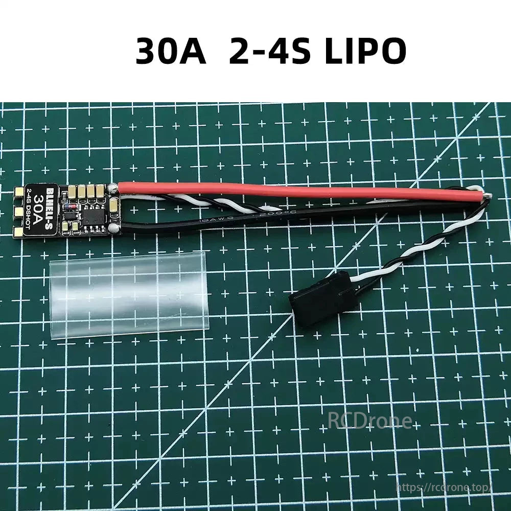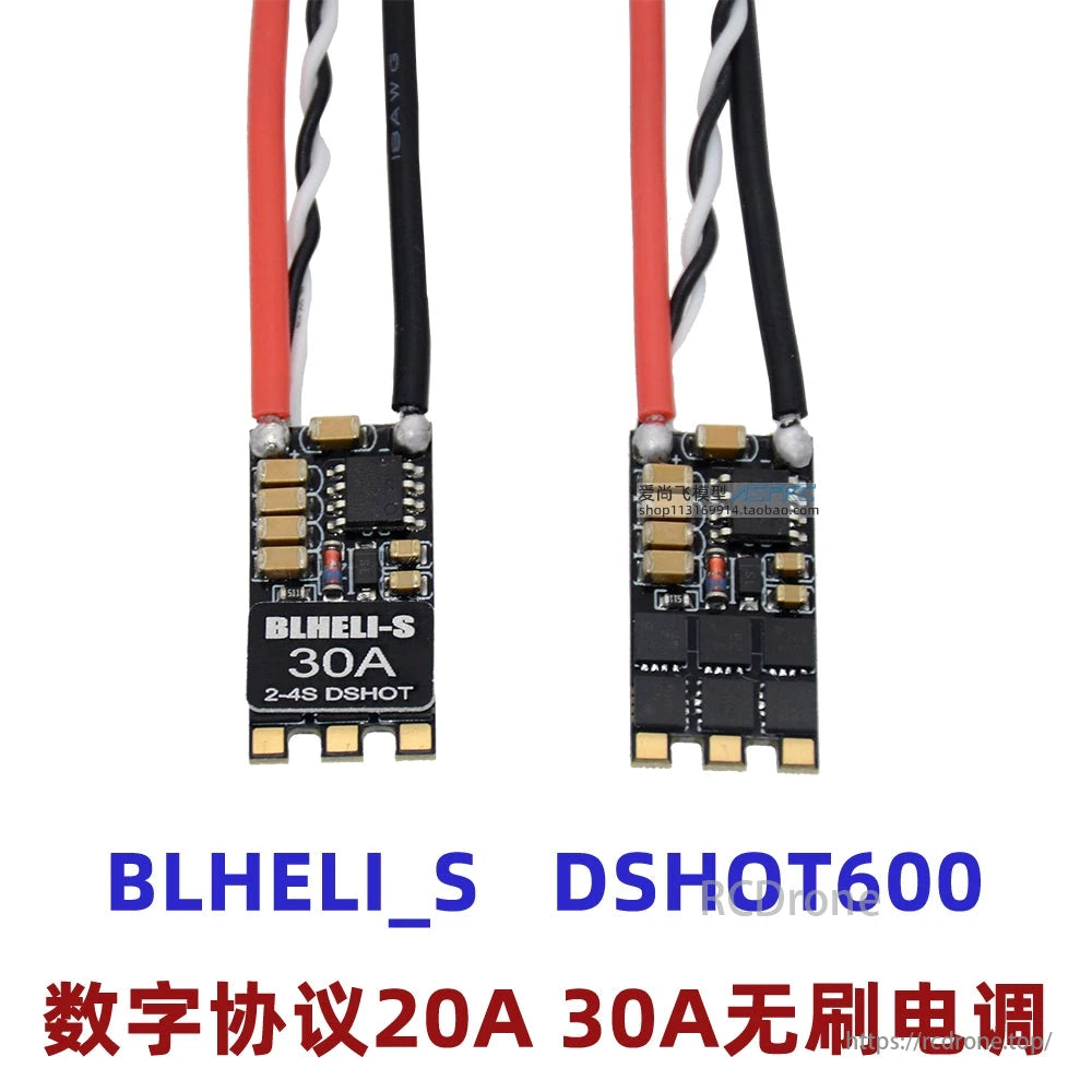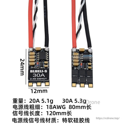 BLHeli_S 30A ESC, 24x12mm, ওজন 5.3g। 20A ভার্সনের ওজন 5.1g। এতে 18AWG 80mm পাওয়ার লাইন এবং 120mm সিগন্যাল লাইন রয়েছে, যা নরম সিলিকন দিয়ে তৈরি।