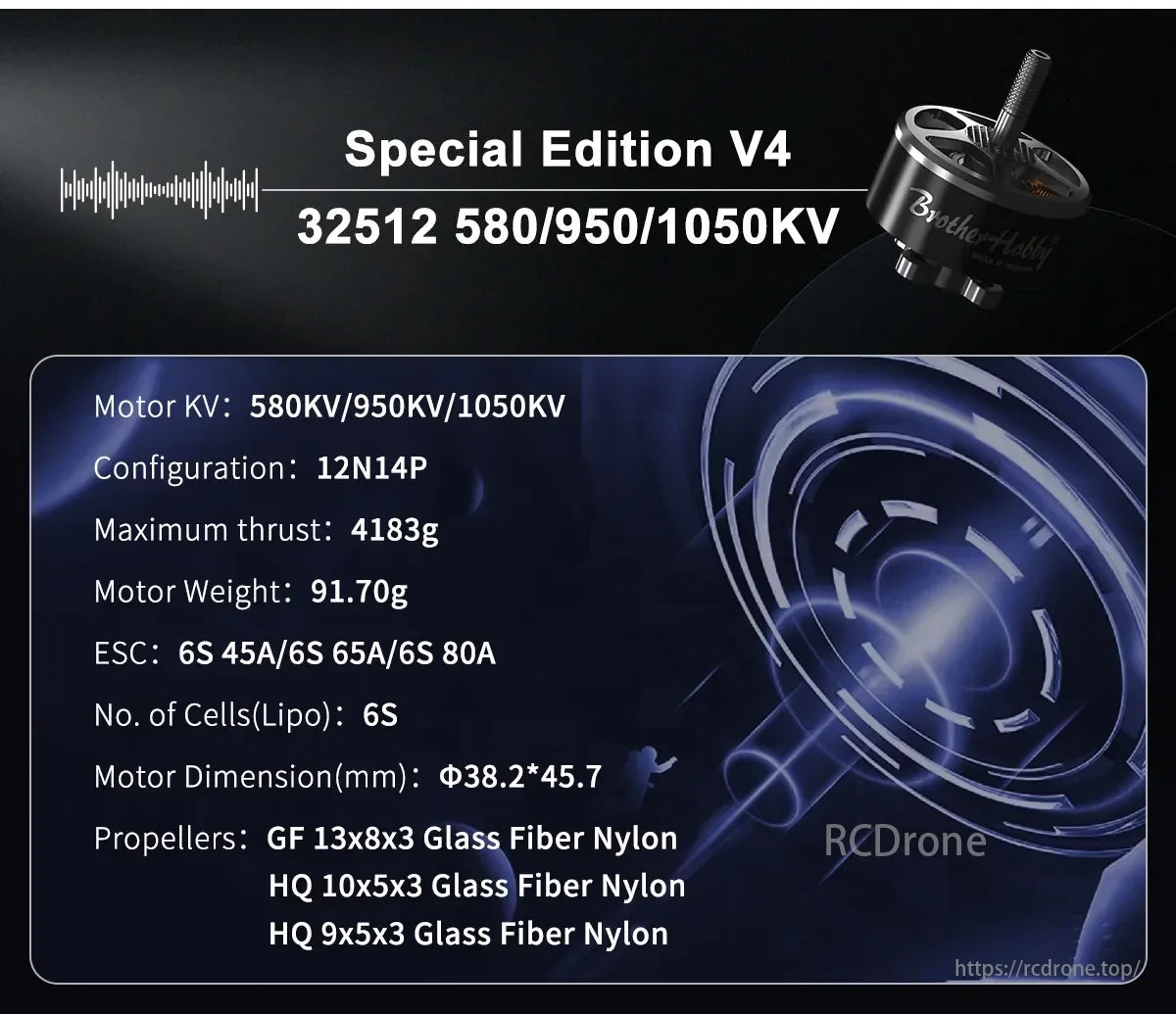 ব্রাদারহবি SE V4 মোটর: 580/950/1050KV, 12N14P, 4183g থ্রাস্ট, 91.70g ওজন। ESC: 6S 45A/65A/80A। মাত্রা: Φ38.2*45.7mm। বিভিন্ন আকারের GF এবং HQ প্রোপেলারের সাথে সামঞ্জস্যপূর্ণ।
