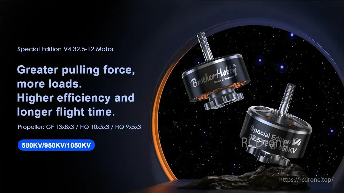 দ্য ব্রাদারহবি স্পেশাল এডিশন V4 32.5-12 ব্রাশলেস মোটর X9, X13 এবং অন্যান্য 9-13 ইঞ্চি বিল্ডের মতো দীর্ঘ-পাল্লার এবং সিনেমাটিক FPV ড্রোনের জন্য বিশেষভাবে তৈরি। পাওয়া যাচ্ছে ৫৮০ কেভি, ৯৫০ কেভি, এবং ১০৫০ কেভি, এই মোটর সিরিজটি 6S LiPo সামঞ্জস্য এবং অসাধারণ কাঠামোগত মানের সাথে দক্ষতা, টর্ক এবং সহনশীলতার জন্য তৈরি।