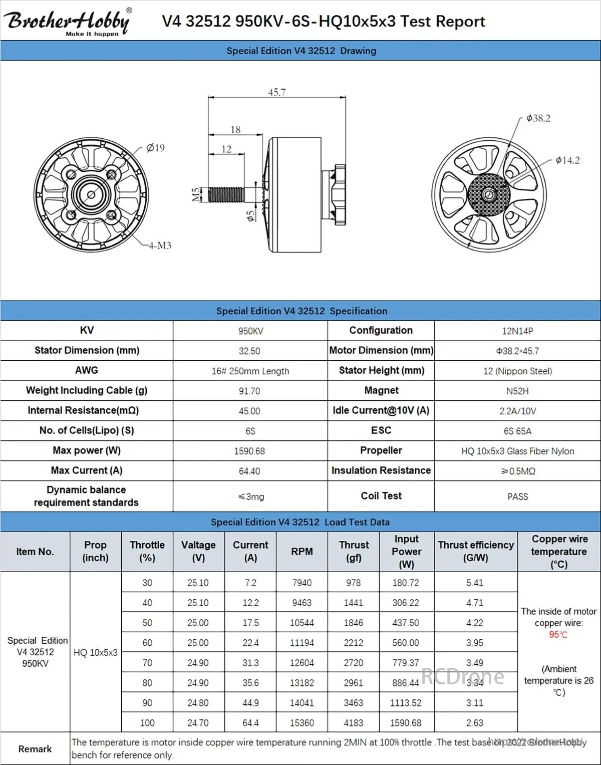 BrotherHobby SE V4 32512 মোটর, 580KV, 6S, 12N14P কনফিগারেশন। মাত্রা: 38.2x45.7 মিমি। ওজন: 92.6 গ্রাম। সর্বোচ্চ শক্তি: 937.5W। GF 13x8x3 প্রোপেলার দিয়ে পরীক্ষিত, 100% থ্রোটলে 8934 RPM পর্যন্ত পৌঁছায়। তামার তারের তাপমাত্রা: 82°C।