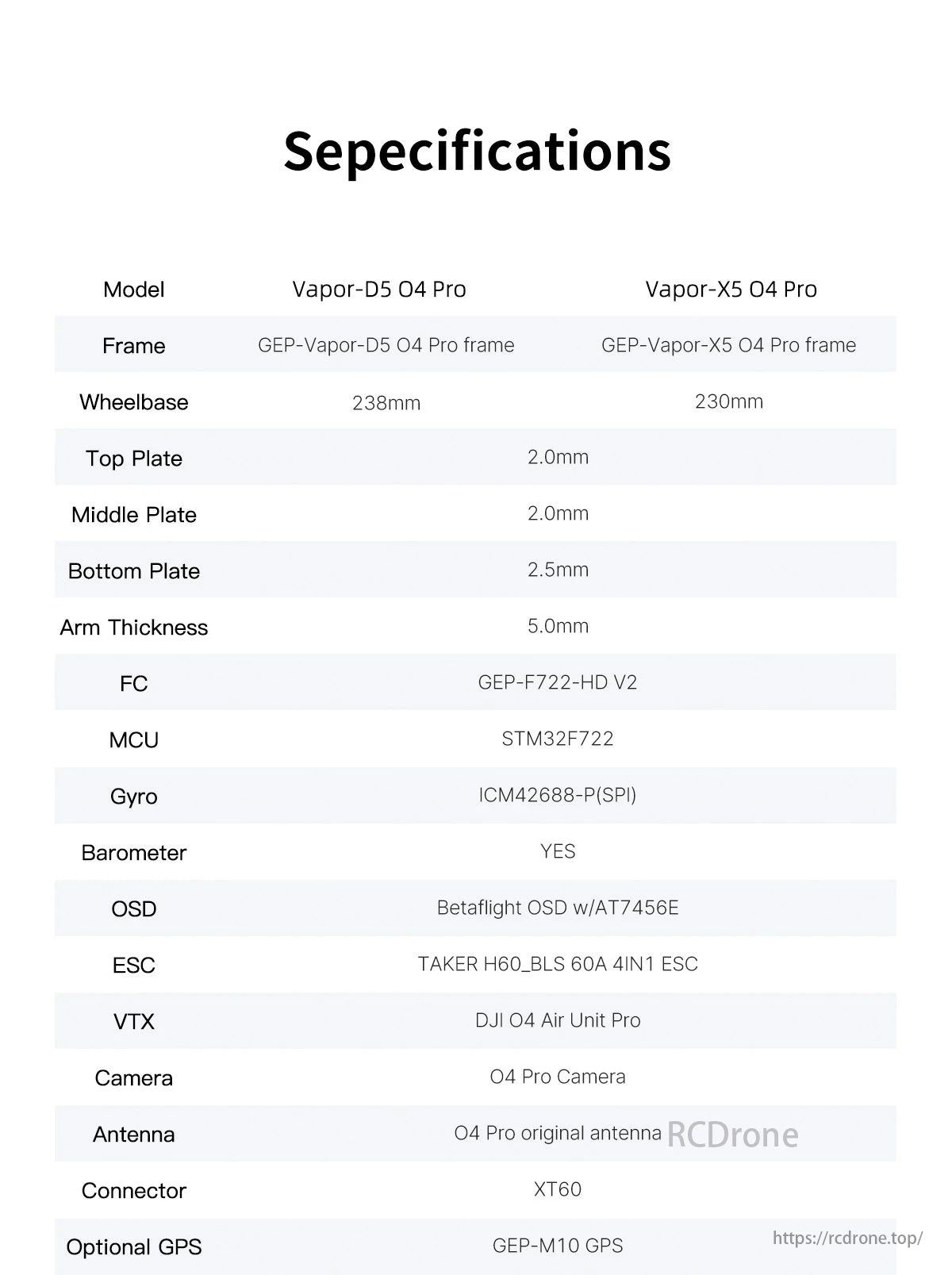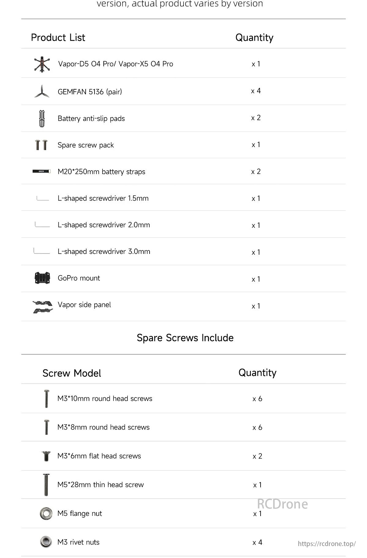 এই পণ্যের তালিকায় Vapor-D5 O4 এবং Prol Vapor-X5 O4 সংস্করণ অন্তর্ভুক্ত রয়েছে। প্যাকেজটিতে একটি GEMFAN 5136 (জোড়া), ব্যাটারি অ্যান্টি-স্লিপ প্যাড, অতিরিক্ত স্ক্রু, M2O*250mm ব্যাটারি স্ট্র্যাপ এবং তিনটি L-আকৃতির স্ক্রু ড্রাইভার রয়েছে। এছাড়াও, এটি একটি GoPro মাউন্ট এবং বিভিন্ন স্ক্রু মডেলের সাথে আসে।