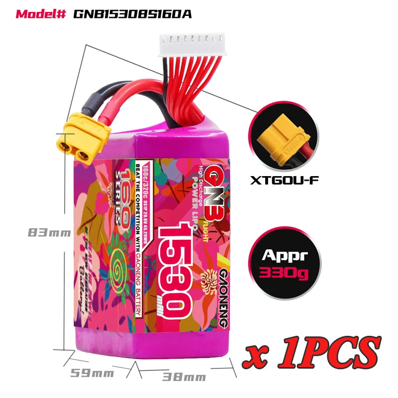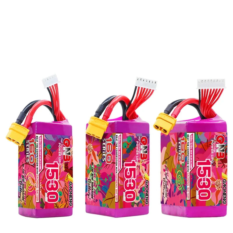 XT60 প্লাগ সহ GNB 4S, 6S, এবং 8S সিরিজের lipo ড্রোন ব্যাটারি, 14.8V, 22.2V, এবং 29.6V বিকল্পগুলি, সেইসাথে 1530mAh ক্ষমতা এবং 160C ডিসচার্জ রেট সমন্বিত৷