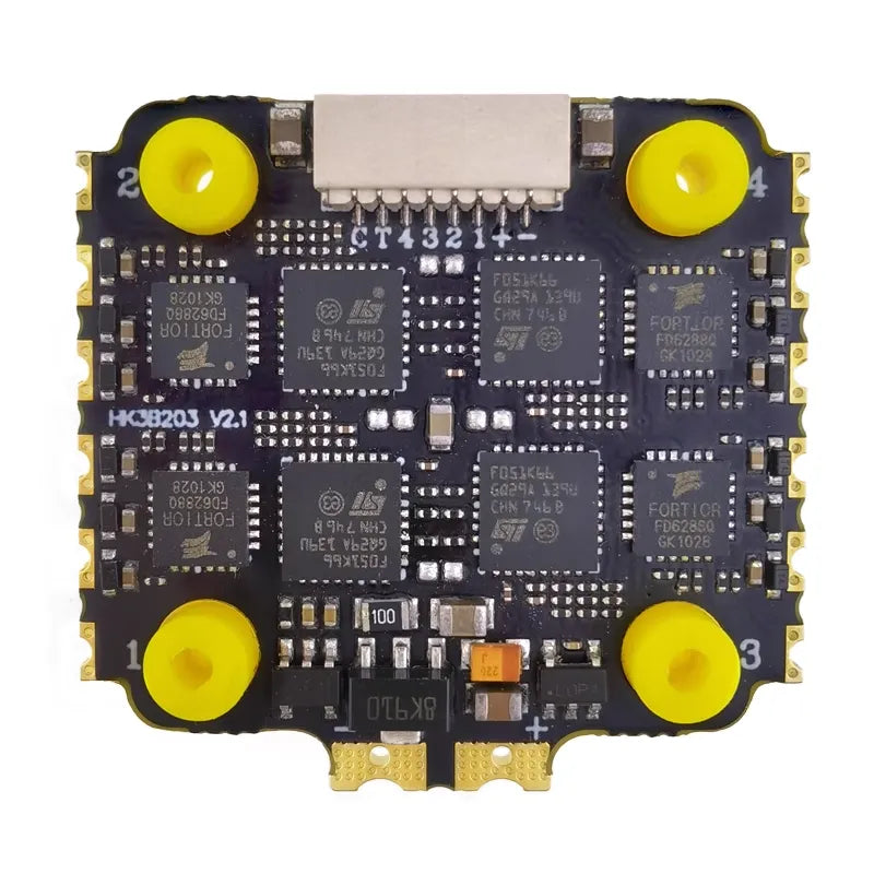 HAKRC 40A 32-বিট 4-ইন-1 ESC একটি উচ্চ-দক্ষতা মিনি ইলেকট্রনিক স্পিড কন্ট্রোলার যা FPV রেসিং ড্রোনের জন্য ডিজাইন করা হয়েছে। 20x20mm কম্প্যাক্ট মাউন্টিং প্যাটার্ন এবং 2–6S LiPo ব্যাটারির সমর্থন সহ, এই ESC হালকা নির্মাণের জন্য আদর্শ। এটি 48MHz-এ চলমান STM32F051 প্রধান নিয়ন্ত্রণ চিপ, আমদানি করা MOSFET এবং মসৃণ মোটর নিয়ন্ত্রণ এবং কম শব্দের জন্য একটি ট্রিপল-ড্রাইভার IC বৈশিষ্ট্যযুক্ত। বোর্ডটি উন্নত কারেন্ট পরিচালনা এবং তাপীয় কর্মক্ষমতার জন্য 3oz পুরু তামার সাথে 6-স্তরের PCB ব্যবহার করে নির্মিত।