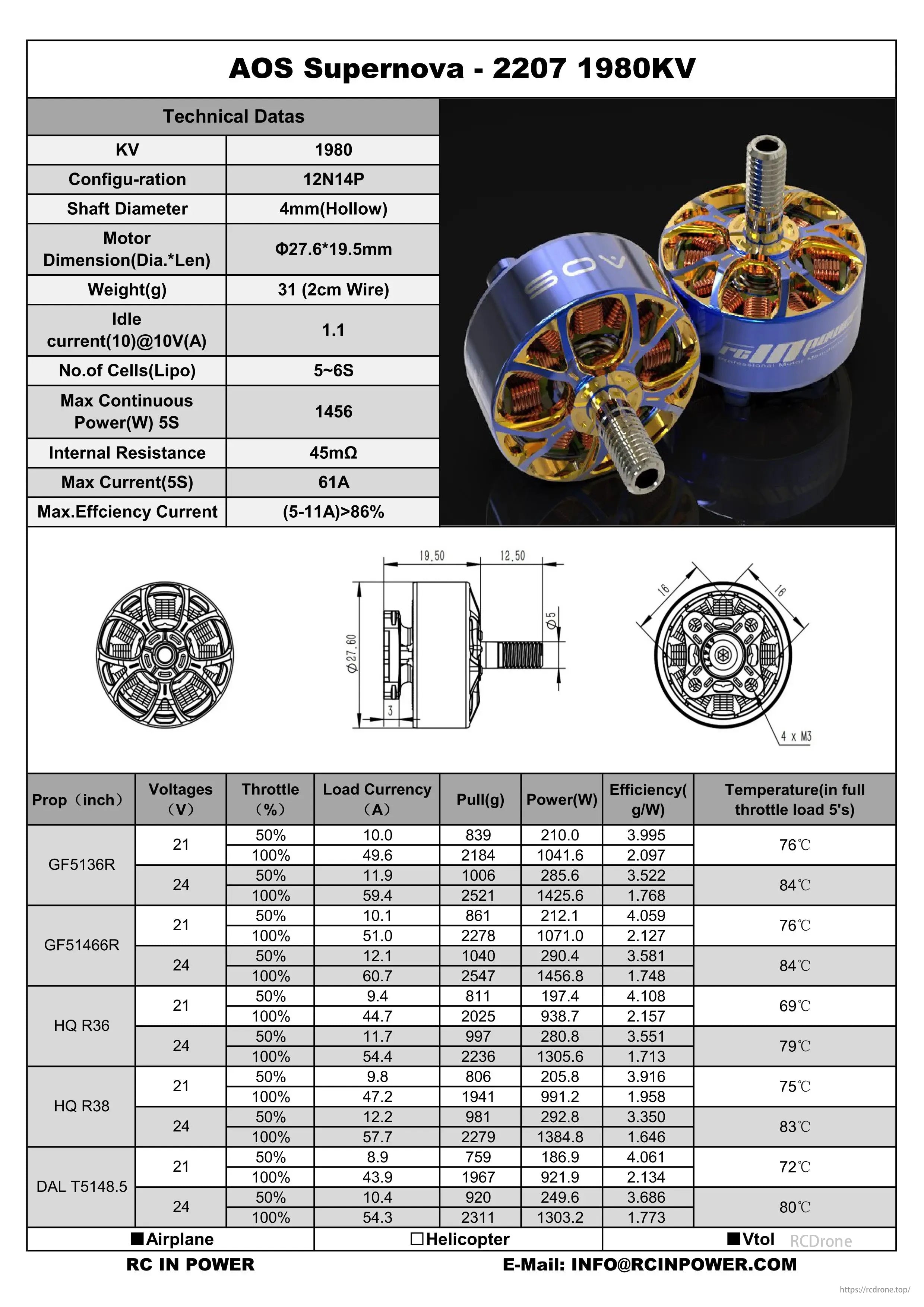 AOS সুপারনোভা 2207 1980KV মোটরের স্পেসিফিকেশন: KV 1980, 12N14P কনফিগারেশন, 4mm শ্যাফ্ট, 31g ওজন। 5S এ সর্বোচ্চ শক্তি 1456W, 61A সর্বোচ্চ কারেন্ট, >86% দক্ষতা। বিভিন্ন প্রপস এবং ভোল্টেজের জন্য বিস্তারিত কর্মক্ষমতা ডেটা অন্তর্ভুক্ত।