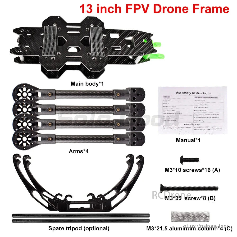 একটি ১৩ ইঞ্চি FPV ড্রোন ফ্রেম কিটে মূল বডি, চারটি বাহু, একটি অতিরিক্ত ট্রাইপড, নির্দেশাবলী এবং স্ক্রু (M3x10, M3x35, M3x21.5 অ্যালুমিনিয়াম কলাম) অন্তর্ভুক্ত রয়েছে।