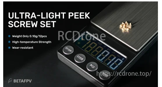 پیچهای PEEK راهحل نهایی برای وزوز سبک وزن است که گرمهای بیشتری را از بدنه میگیرد. پیچ های PEEK فقط 0.10 گرم / 12 قطعه وزن دارند، می تواند تا 0.46 گرم برای ساختی که از پیچ های فلزی استفاده می کند، صرفه جویی کند، در حالی که هنوز قوی تر و بادوام تر از پیچ های نایلونی است. پیچ های PEEK با مقاومت در برابر حرارت، ضد اصطکاک، ضد ضربه و ضد خستگی بیشتر، قابل اعتماد و بادوام هستند. آنها برای ساخت پهپادهای 65/75 میلی متری، از جمله سبک وزن، مناسب هستند سری شهاب سنگ پهپاد