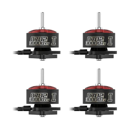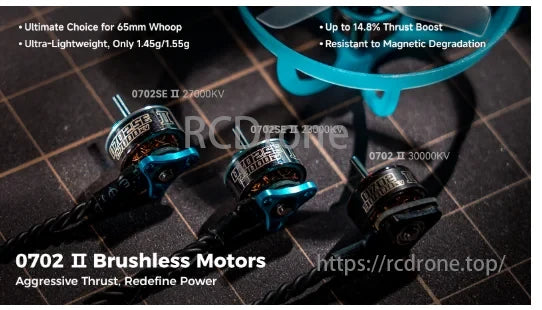 - موتورهای 0702 II دارای بلبرینگ دوگانه هستند و وزن آن فقط 1.55 گرم است. برای خلبانانی که به دنبال سرعت های بالاتر هستند، 30000KV ضربه بیشتری به دریچه گاز می دهد، که برای مسابقات FPV داخلی و پروازهای تهاجمی ایده آل است.