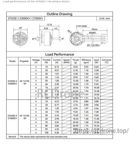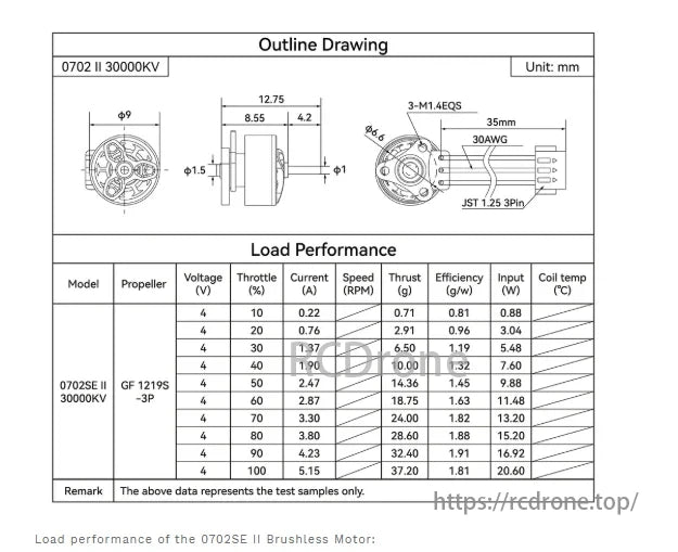 مشخصات موتور براشلس 0702 II 30000KV: قطر 9 میلی متر، شفت 1.5 میلی متر. عملکرد بار با ملخ GF 1219S-3P در 4 ولت شامل داده های رانش، راندمان و دمای سیم پیچ برای درصدهای مختلف دریچه گاز است.
