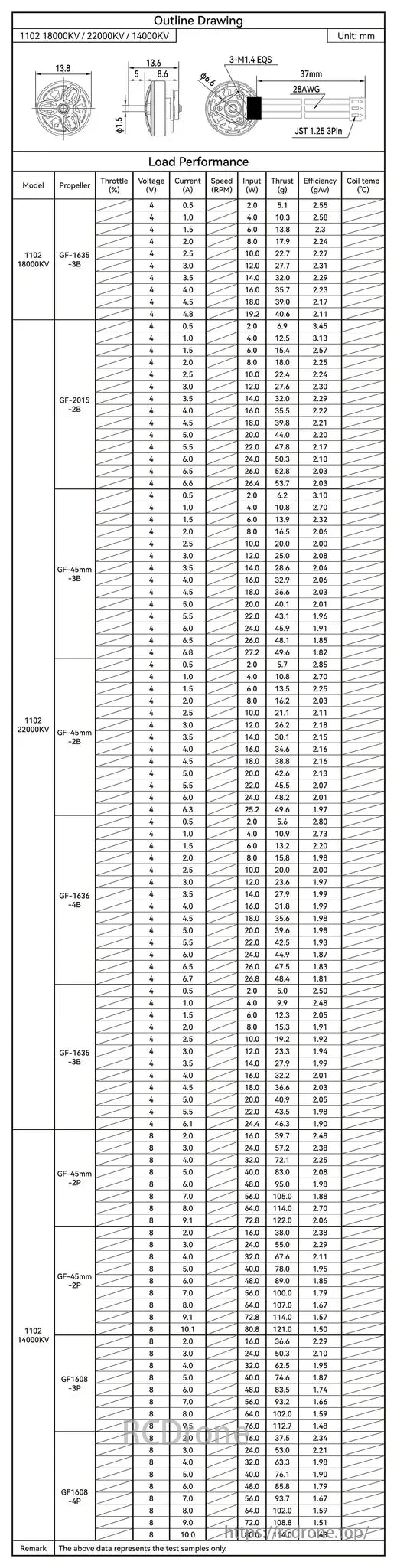 مشخصات موتور BETAFPV 1102 22000KV 1S Brushless FPV شامل ابعاد، عملکرد بار با پایه های مختلف، ولتاژ، جریان، سرعت، رانش، راندمان و داده های دمای سیم پیچ برای عملکرد بهینه پرواز است.