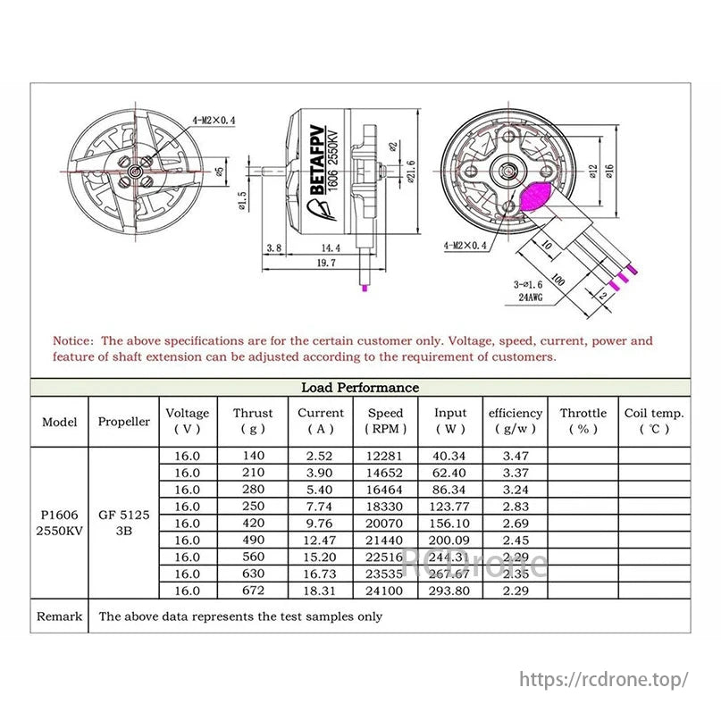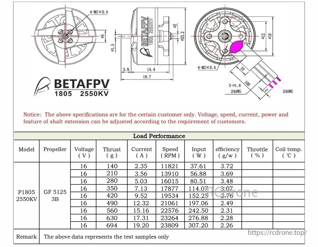 مشخصات موتور بدون جاروبک BETAFPV 1805 / 1606 شامل ولتاژ، رانش، جریان، سرعت، توان ورودی، راندمان، دریچه گاز و دمای سیم پیچ است. داده ها نمونه های آزمایشی را برای تنظیمات خاص مشتری نشان می دهد.