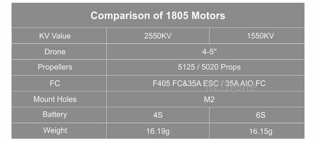 1805 Motors برای کاهش وزن، به جای شفت رزوه، طراحی شفت φ1.5 میلی متری را حفظ می کند، به این معنی که برای قفل کردن پایه ها به پیچ های M2 نیاز دارد، در حالی که اکثر پایه های 4 اینچی در بازار با مهره قفل می شوند.