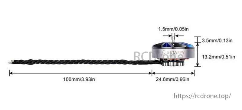 ابعاد موتور BETAFPV 2004 3000KV 4S: سیم 100 میلی متر، بدنه 24.6 میلی متر، شفت 13.2 میلی متر.