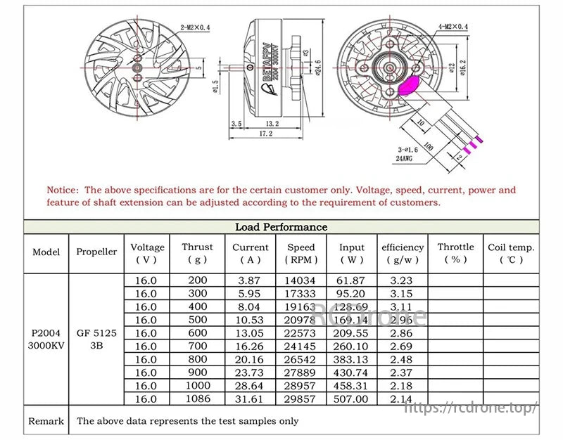 مشخصات موتور BETAFPV 2004 3000KV: ولتاژ 16 ولت، رانش 200-1086 گرم، جریان 3.87-31.61 آمپر، سرعت 14034-29857 RPM، توان ورودی 61.87-507W، راندمان g23-2.4.1. قابل تنظیم برای نیازهای خاص