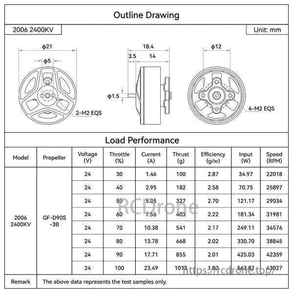 BETAFPV LAVA 2006 2400KV 6S Brushless Motor: طرح کلی با ابعاد بر حسب میلی متر.داده های عملکرد را برای درصدهای مختلف دریچه گاز، از جمله ولتاژ، جریان، رانش، راندمان، توان ورودی و سرعت (RPM) بارگذاری کنید.