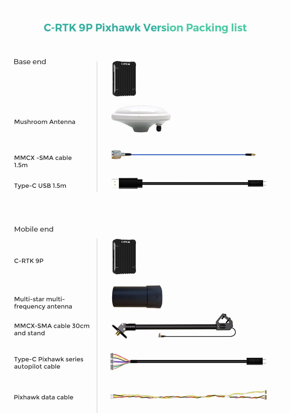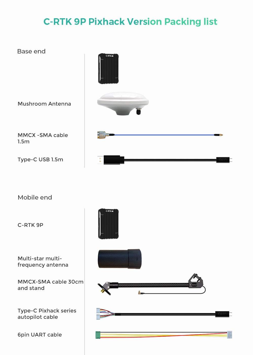 بسته CUAV C-RTK 9P شامل: * انتهای پایه: آنتن قارچ CAAD، کابل MMCX-SMA (1.5 متر) و USB Type-C (1.5 متر) * انتهای موبایل: آنتن چند ستاره چند فرکانس CRCD C-RTK 9P، کابل MMCX-SMA (30 سانتی متر) و پایه. همچنین با خلبان خودکار سری Pixhawk سازگار است.