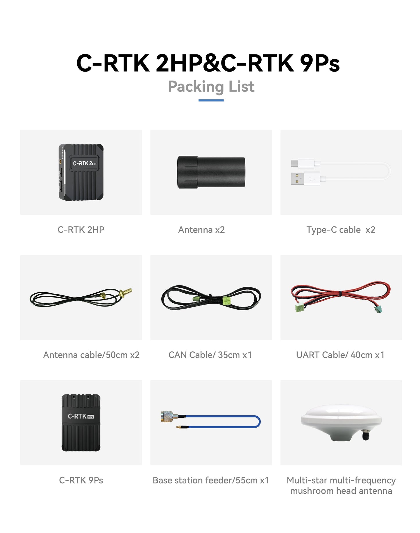 ماژول CUAV New C-RTK 2HP دارای دو کابل Type-C، دو کابل CAN (هر کدام 35 سانتی متر)، یک کابل UART (40 سانتی متر) و یک C-RTK PS، و همچنین یک کابل چند ستاره است. , آنتن سر قارچ چند فرکانس.
