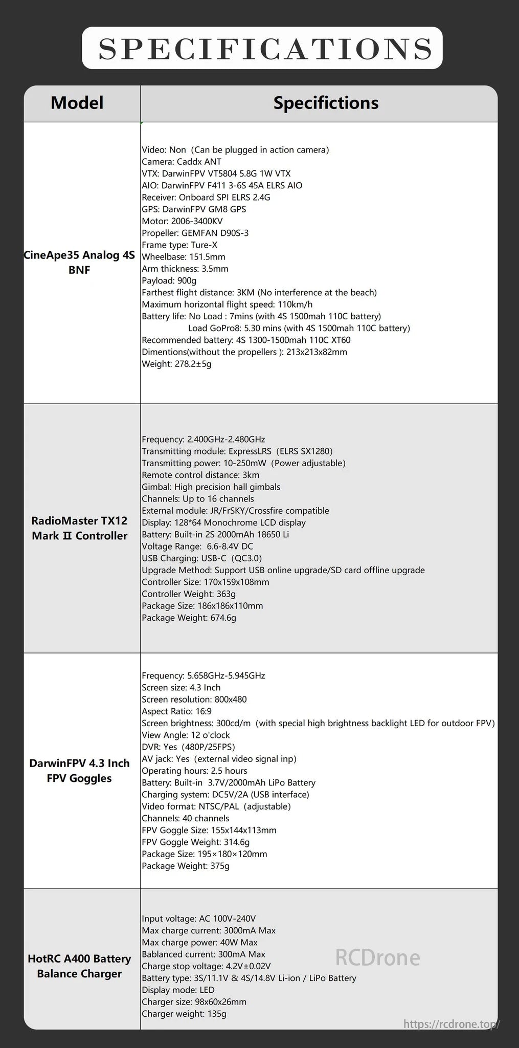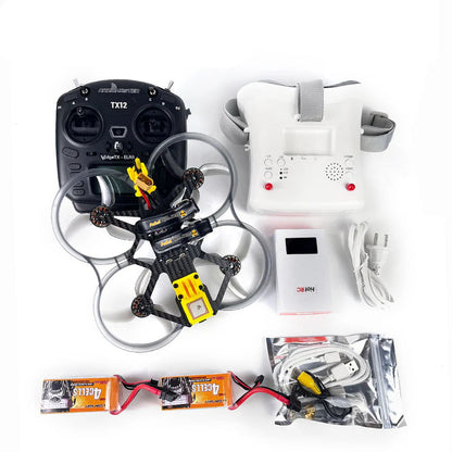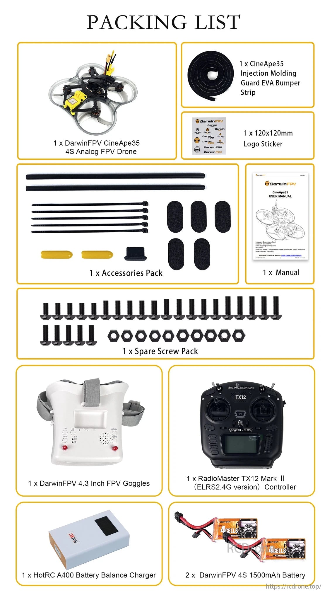 پهپاد آنالوگ DarwinFPV CineApe35 4S، نوار سپر EVA، برچسب لوگو، بسته لوازم جانبی، دفترچه راهنما، بسته پیچ یدکی، عینک FPV، دسته TX12، شارژر باتری و دو باتری 4S 1500mAh شامل میشود.
