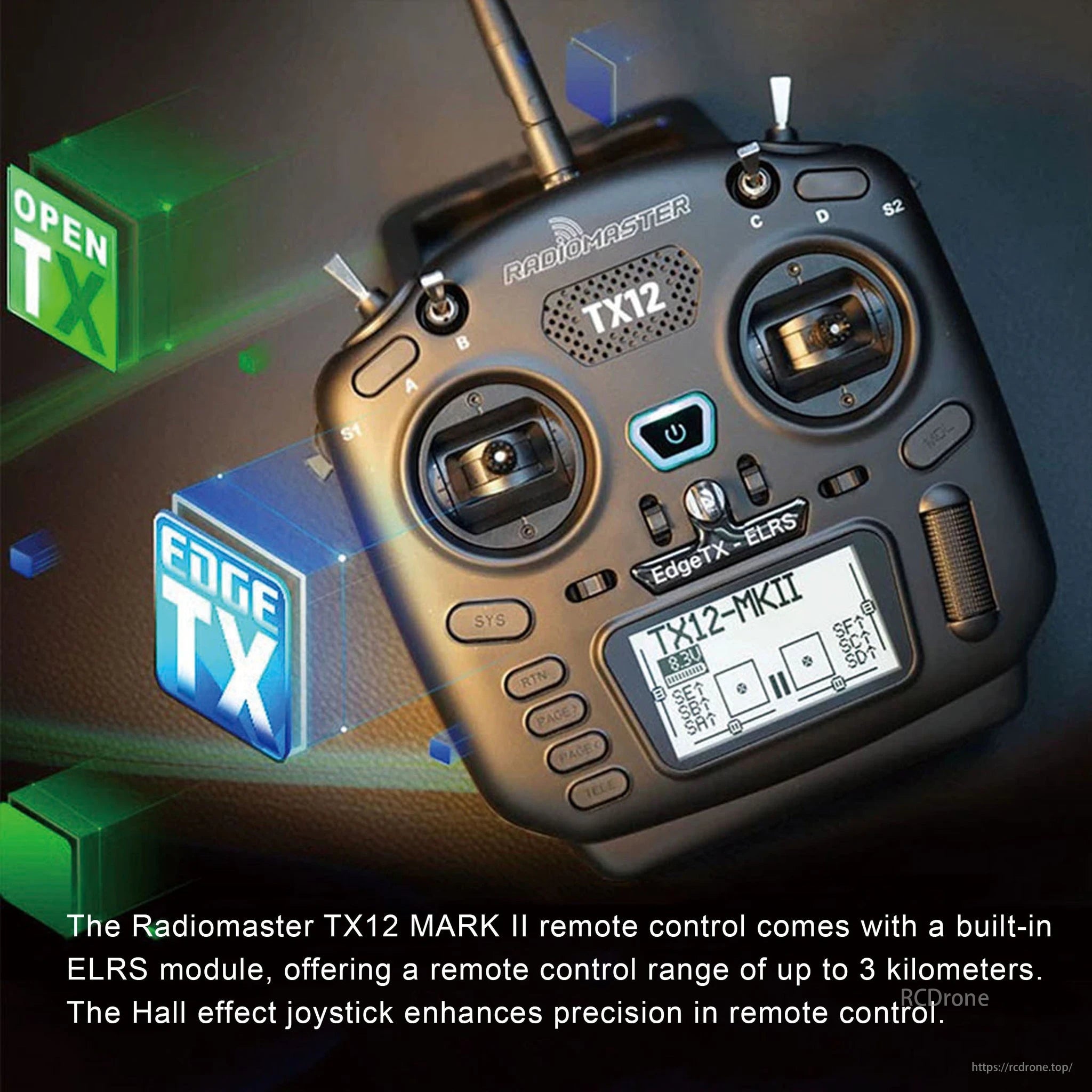 کنترلر ELRS 2.4G با جوی استیک اثر هالرادیومستر TX12 MKII کنترل فوقالعاده دقیقی و برد ۳ کیلومتری ارائه میدهد.
