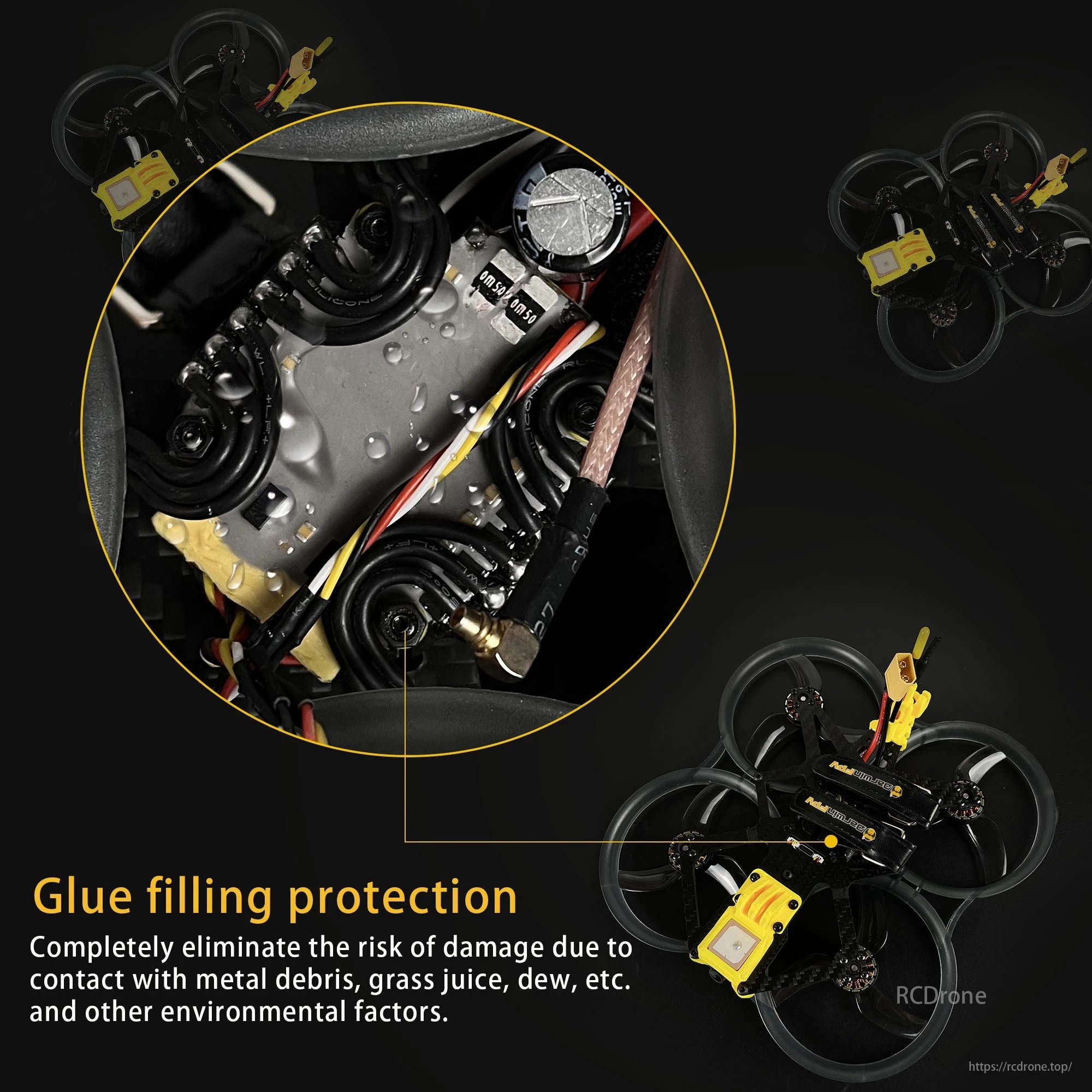 محافظ AIO پر شده با چسب: از قطعات الکترونیکی در برابر خردههای فلز، آب علف، شبنم و سایر خطرات محیطی محافظت میکند.