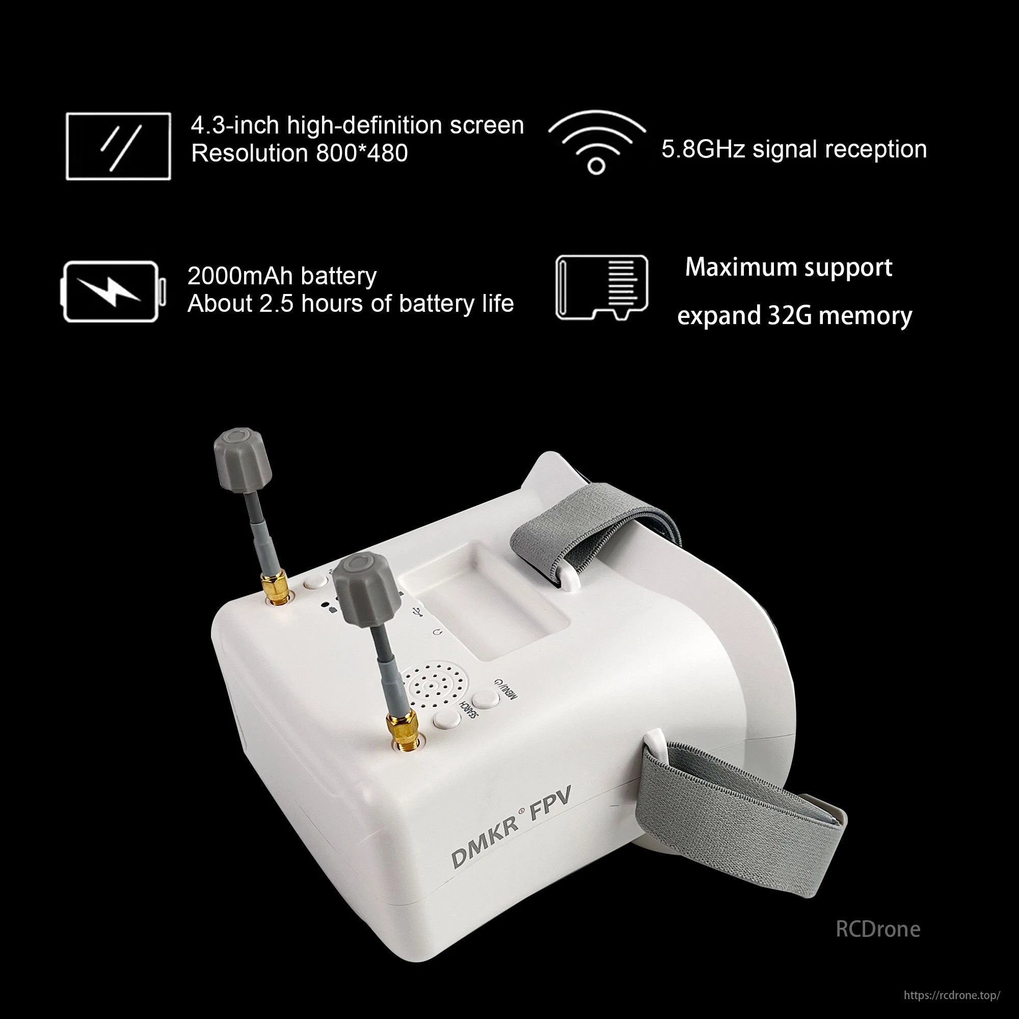 ۴.۳ اینچ عینک FPV با دی وی آرطراحی آنتن دوگانه با وضوح تصویر ۸۰۰x۴۸۰ و عمر باتری ۲.۵ ساعته.