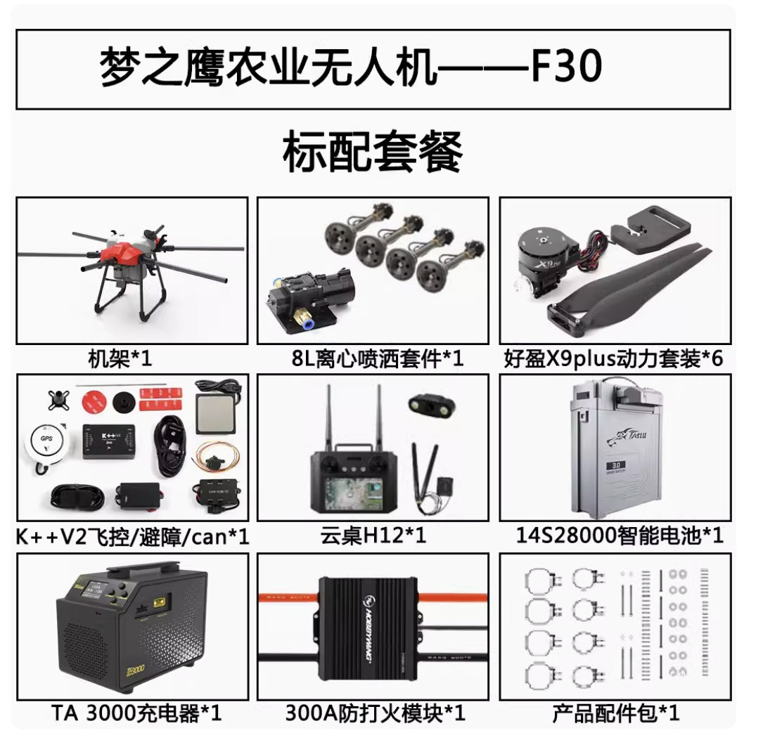 کیت قاب Drone 6-Axis Agriculture Dreameagle F30 دارای طراحی پلاگین با مشخصات اندازه سه بعدی است. اندازه گسترش یافته 2030 * 1915 * 770 میلی متر است، در حالی که اندازه تا شده 1145 * 760 * 905 میلی متر است. فاصله بین دو محور محصول 2150 میلی متر است و اندازه بازو JI لوله فیبر کربنی 37 * 40 میلی متر است. وزن محصول 13.98 کیلوگرم (وزن قفسه بندی) یا حداکثر 27 کیلوگرم (بالاترین پیکربندی بدون باتری) است. این پهپاد می تواند به عرض 3-5.5 متر (تقریباً 1.5-3 متر از ارتفاع محصول) اسپری کند. زمان شناور 25 دقیقه برای شناور بدون بار در 28000 میلی آمپر ساعت و وزن برخاست 770 میلی متری 36.5 کیلوگرم، یا 10 دقیقه برای شناور شدن با بار کامل در 28000 میلی آمپر ساعت و وزن برخاست 760 میلی متری 66.5 کیلوگرم است. وزن حمل 30 کیلوگرم و حداکثر ارتفاع برخاست 905 میلی متر است.