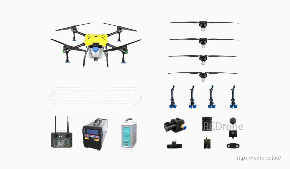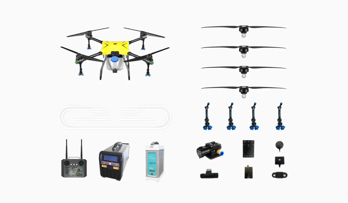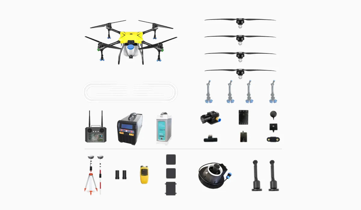 کیت استاندارد قاب کیت پیشرفته X1 GNSS (GPS/Beidou/GLONASS) نازل های اسپری چراغ نشانگر وضعیت X4 نازل های اسپری دوربین FPV نازل های اسپری دوربین پمپ آب ناوبری نور چراغ ناوبری پمپ آب در شب کنترل فلاش متر اینتل کنترل پرواز باتری شارژر هوشمند 1 ایستگاه پایه ماژول RTK نشانگر جلوگیری از مانع جلو رادار نشانگر دستی نازل گریز از مرکز سیستم پخش جریان سنج کنترل از راه دور بی سیم