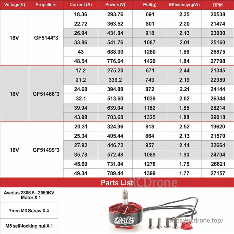 داده های موتور HGLRC Aeolus 2306.5-2550KV در ولتاژ 16 ولت با پایه های GF5144*3، GF51466*3 و GF51499*3. شامل ولتاژ، جریان، توان، کشش، راندمان، RPM و لیست قطعات موتور، پیچ و مهره است.
