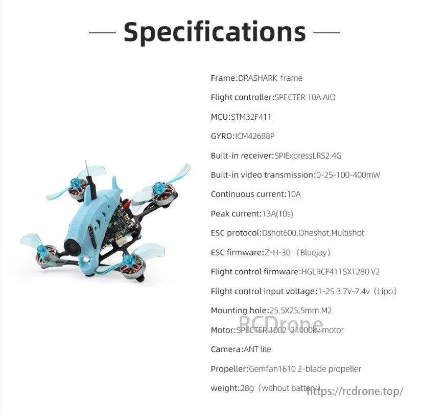 مشخصات FPV 1.6 اینچی Drashark V2: قاب DRASHARK، کنترلر AIO SPECTER 10A، MCU STM32F411، ژیروسکوپ ICM42688P، گیرنده SPIExpressLRS2.4G، انتقال تصویر 0-400 میلی وات، جریان مداوم 10 آمپر، پروتکل Dshot600 ESC، فریمور ZH-30، کنترل پرواز HGLRCF411SX1280 V2.