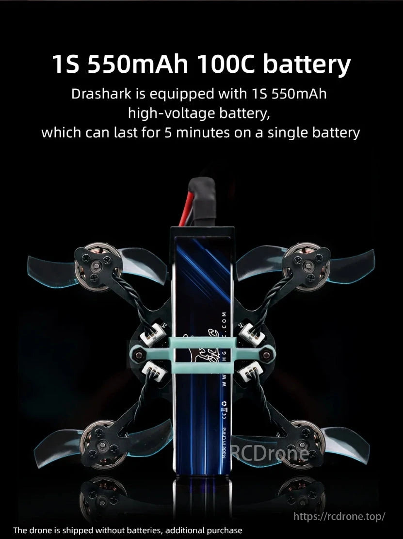 باتری Drashark V2 1S با ظرفیت ۵۵۰ میلیآمپر ساعت و ظرفیت ۱۰۰C، ۵ دقیقه دوام میآورد. بدون باتری ارسال میشود؛ خرید باتری اضافی الزامی است.