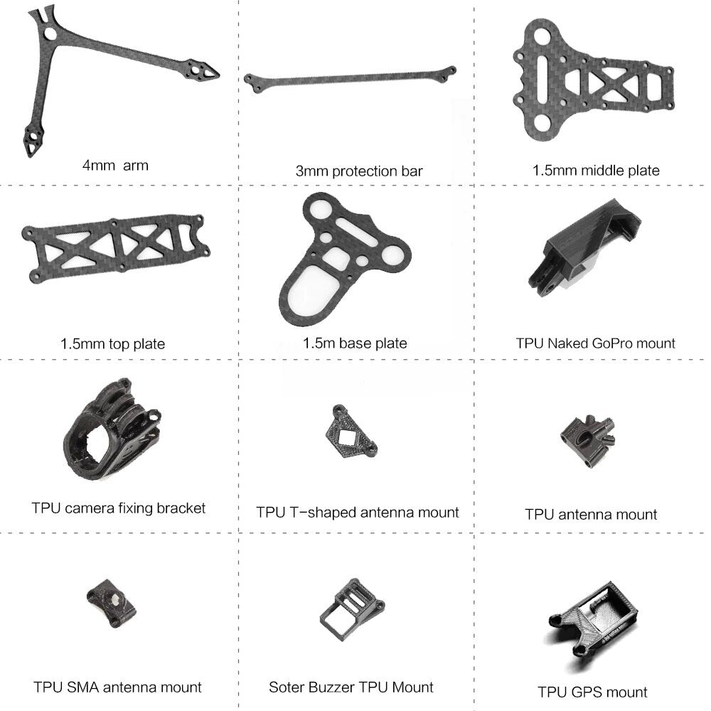 کیت قاب HGLRC Rekon 6 شامل پایه GPS، نوار محافظ در برابر ضربه و پایه زنگ دار است. این کیت دارای یک پایه GPS رزرو شده TPU است که برای قرار دادن یک دوربین GoPro SMO برهنه با قابلیت فیلمبرداری 4K طراحی شده است. دوربین Insta36 g0 به صورت جداگانه فروخته می شود. مهاربندهای اختیاری برای بهبود میرایی لرزش و افزایش مقاومت در برابر ضربه در دسترس هستند.