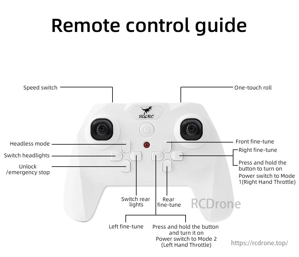 راهنمای کنترل از راه دور برای HGLRC Wingy 65mm FPV. دارای دکمه تغییر سرعت، حالت بدون سر، چراغهای جلو، قفل/توقف اضطراری، چراغهای عقب، دکمههای تنظیم دقیق، چرخش تک لمسی و حالتهای قدرت برای دریچه گاز سمت راست و چپ.