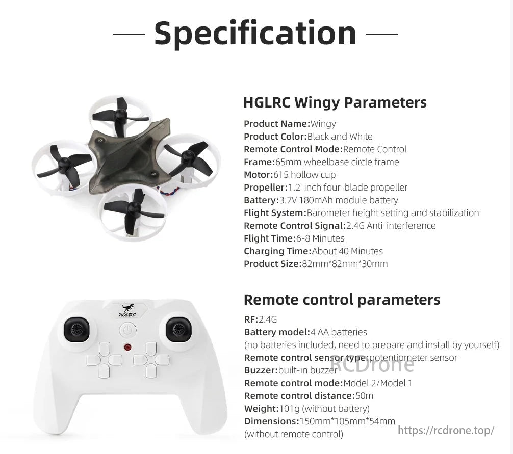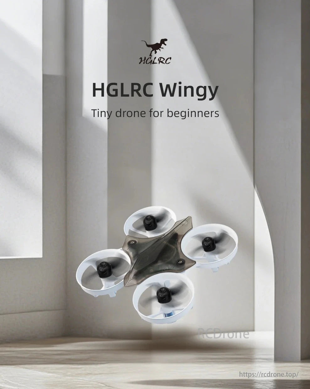 HGLRC Wingy: فاصله بین دو محور ۶۵ میلیمتر، کنترل از راه دور، ملخهای ۱.۲ اینچی، باتری ۳.۷ ولت، زمان پرواز ۶-۸ دقیقه. کنترل از ۴ باتری قلمی استفاده میکند، برد ۵۰ متر، وزن ۱۰۱ گرم. ایدهآل برای پرواز FPV در فضای بسته.