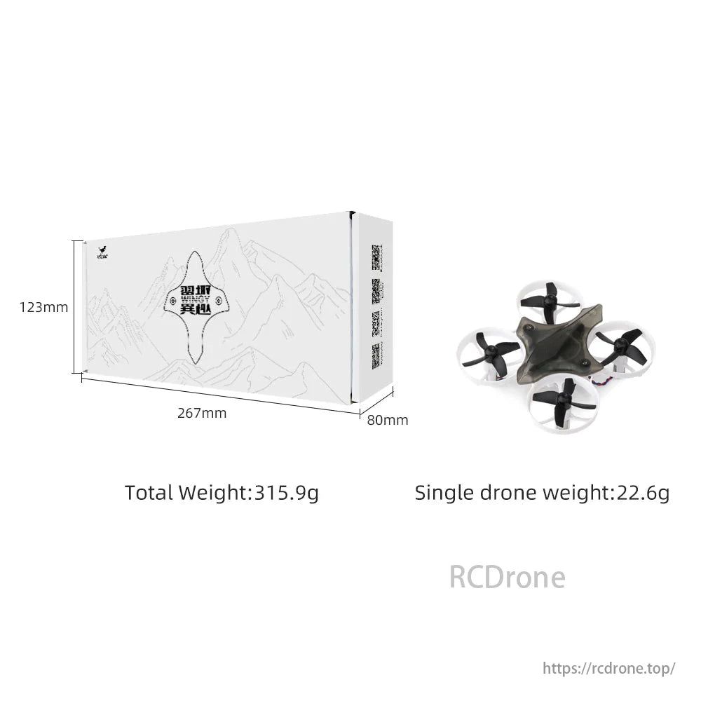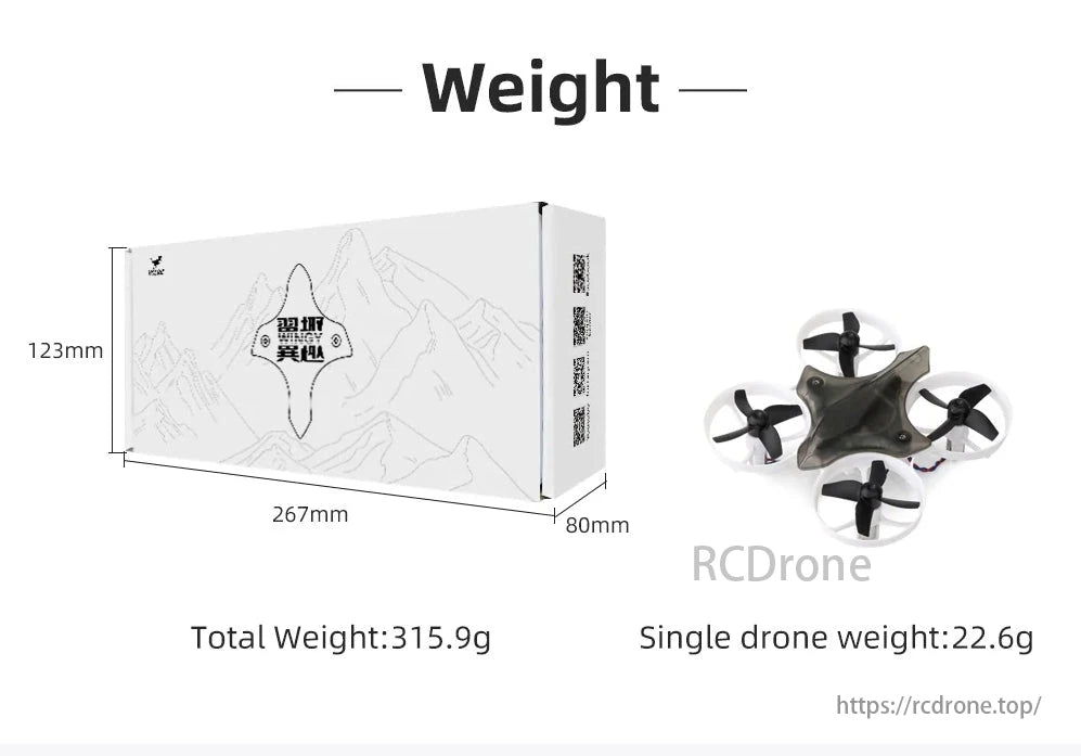 پهپاد FPV داخلی HGLRC Wingy با قطر ۶۵ میلیمتر و قطر ۱.۲ اینچ برای محیط داخلی. ابعاد جعبه: ۲۶۷x۱۲۳x۸۰ میلیمتر. وزن کل: ۳۱۵.۹ گرم. وزن هر پهپاد: ۲۲.۶ گرم.