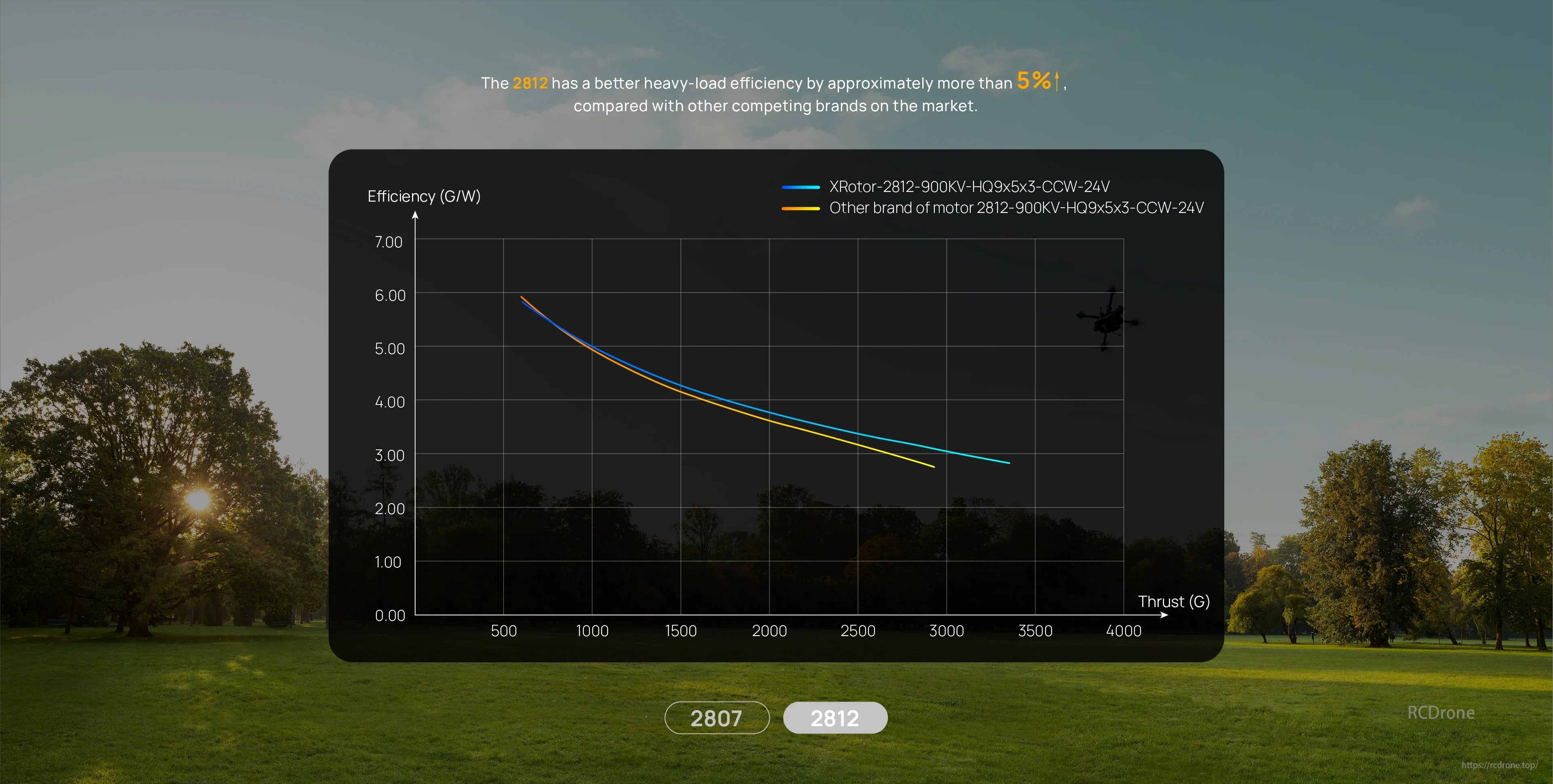 موتورهای Hobbywing Xrotor 2812 دارای راندمان بالا در بار سنگین هستند و بیش از 5٪ از برندهای رقیب پیشی می گیرند. راندمان (G/W) در برابر رانش (G) ترسیم میشود، با 2812 گزینه بهتر در تمام سطوح رانش. نمودار Xrotor-2812-900KV-HQ9x5x3-CCW-24V را با موتور مشابه برند دیگری مقایسه می کند. در مقادیر رانش کمتر، شکاف راندمان بیشتر می شود و مزیت 2812 را برجسته می کند. این عملکرد آن را برای برنامههای کاربردی که نیاز به مصرف بهینه انرژی دارند، ایدهآل میکند.مدل 2807 نیز ذکر شده است که مجموعه ای از گزینه های موتور کارآمد را پیشنهاد می کند.