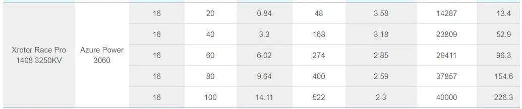 موتور XRotor Race Pro با Azure Power 3060، معیارهای عملکرد شامل RPM، ولتاژ، جریان و کارایی در تنظیمات مختلف است.