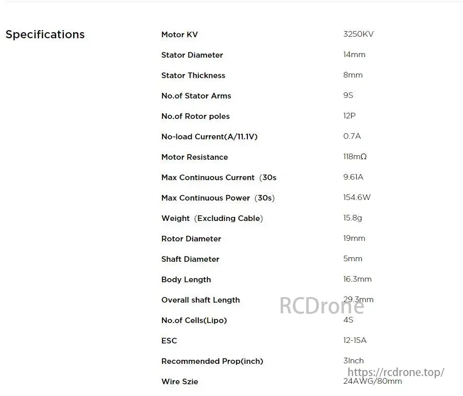 موتور XRotor 1408 Race Pro 4S: 3250KV، استاتور 14mm، بازوهای 9S، قطب های 12P. حداکثر جریان 9.61 آمپر، توان 154.6 وات. وزن 15.8 گرم، روتور 19 میلی متر، شفت 5 میلی متر. از 4S Lipo، 12-15A ESC، پایه 3 اینچی استفاده می کند.
