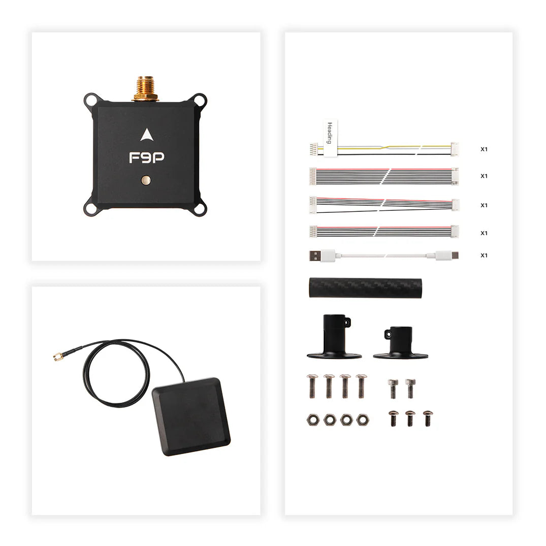 دستگاه GPS مدل Holybro H-RTK NEO-F9P به همراه ایستگاههای پایه و کاوشگر، رادیوهای تلهمتری و کنترلکننده پرواز برای ناوبری دقیق.