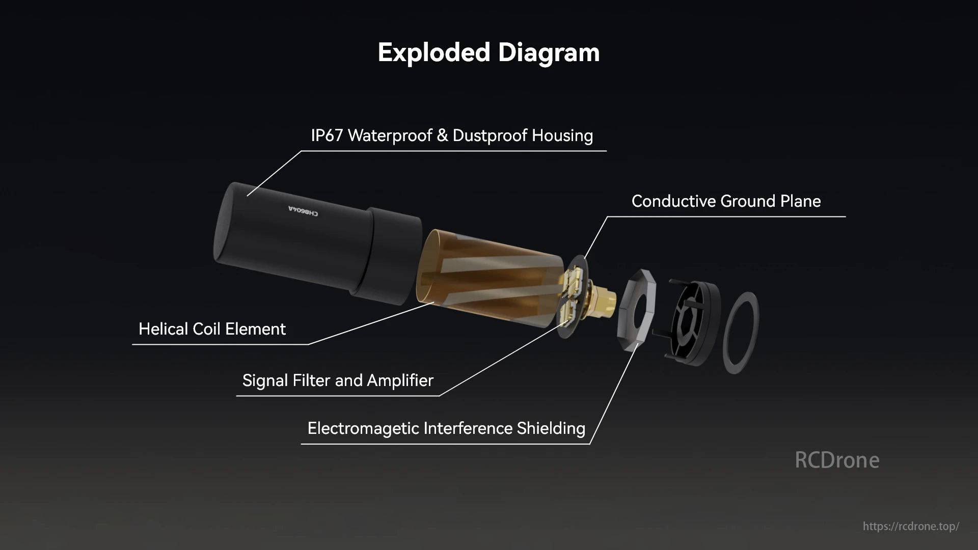 نمودار تفصیلی دستگاه GPS با محفظه IP67، سیمپیچ مارپیچی، فیلتر سیگنال، تقویتکننده و محافظ EMI.