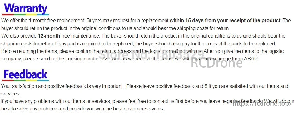 سیاست گارانتی یک ماه تعویض رایگان را در عرض 15 روز پس از دریافت ارائه می دهد و خریدار مسئول هزینه های حمل و نقل است. یک دوره تعمیر و نگهداری رایگان 12 ماهه نیز ارائه می شود که خریدار هزینه های حمل و نقل و تعویض قطعه را پوشش می دهد. بازخورد تشویق میشود و به مشتریان توصیه میشود قبل از گذاشتن بازخورد منفی، ابتدا برای هر مشکلی با فروشنده تماس بگیرند.