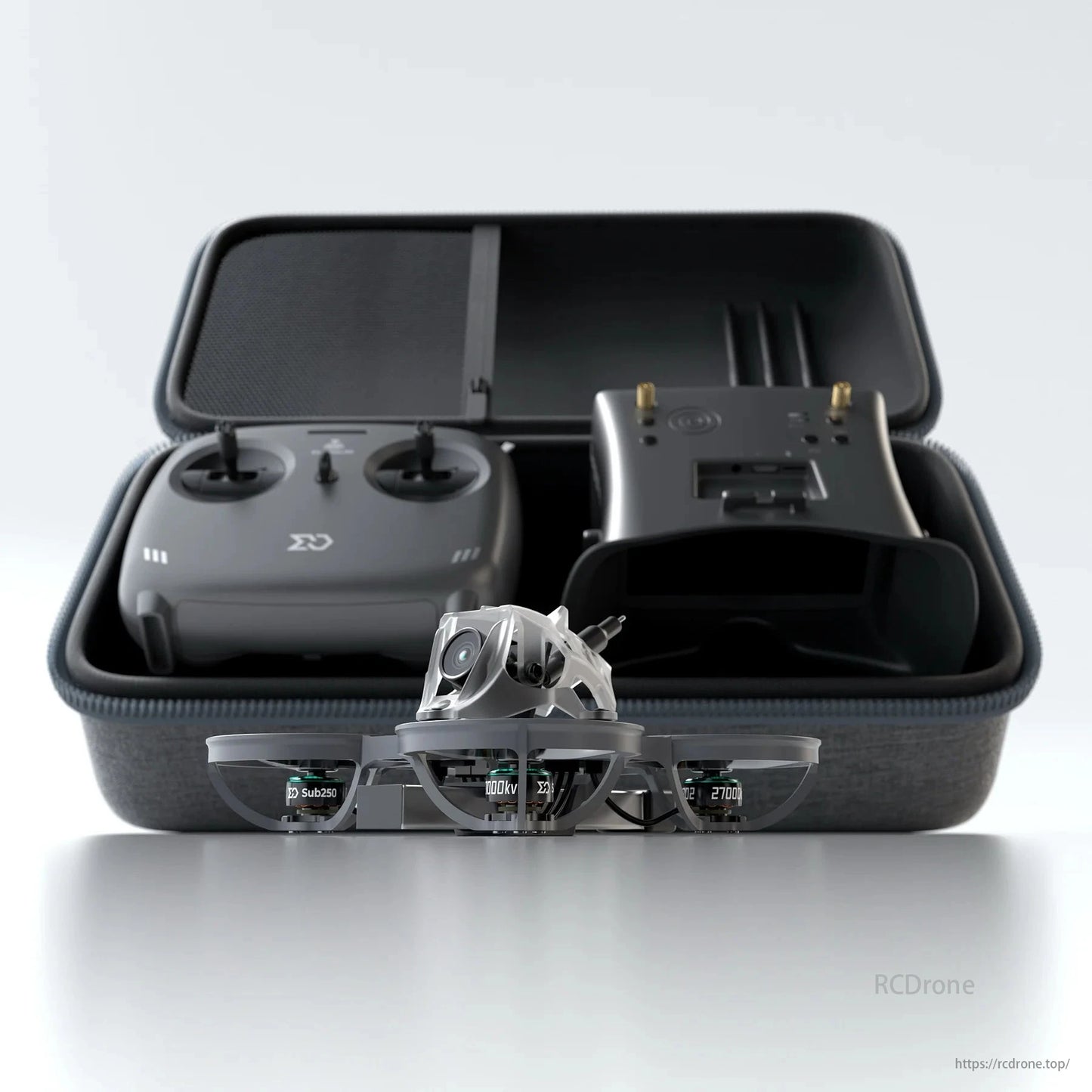 پهپاد 65 میلیمتری Whoop مدل Sub250 به همراه کیف، ریموت، پهپاد، باتری، لوازم جانبی، شارژر، ابزار و دفترچه راهنما ارائه میشود. این پهپاد که برای مسابقات FPV ایدهآل است، مونتاژ و استفاده آسان را به همراه دستورالعملها و لوازم جانبی دقیق ارائه میدهد.