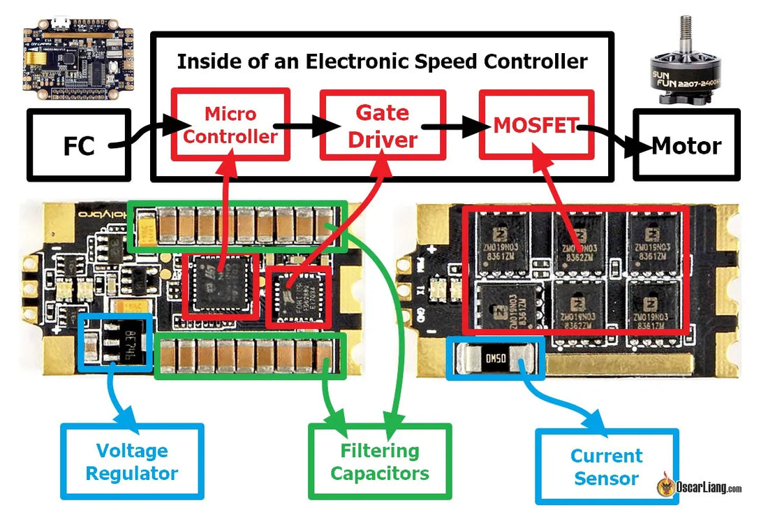 Les MOSFET agissent comme des interrupteurs dans le circuit du contrôleur de vitesse électronique (ESC), allumant et coupant rapidement l'alimentation du moteur. Ils gèrent le courant et la tension élevés nécessaires à son fonctionnement. La taille et la qualité des MOSFET ont un impact direct sur la capacité du contrôleur à gérer la puissance et à résister aux pics de tension. Des MOSFET de plus grande taille sont généralement associés à des tensions et des courants plus élevés, contribuant ainsi à une plus grande robustesse du contrôleur.
