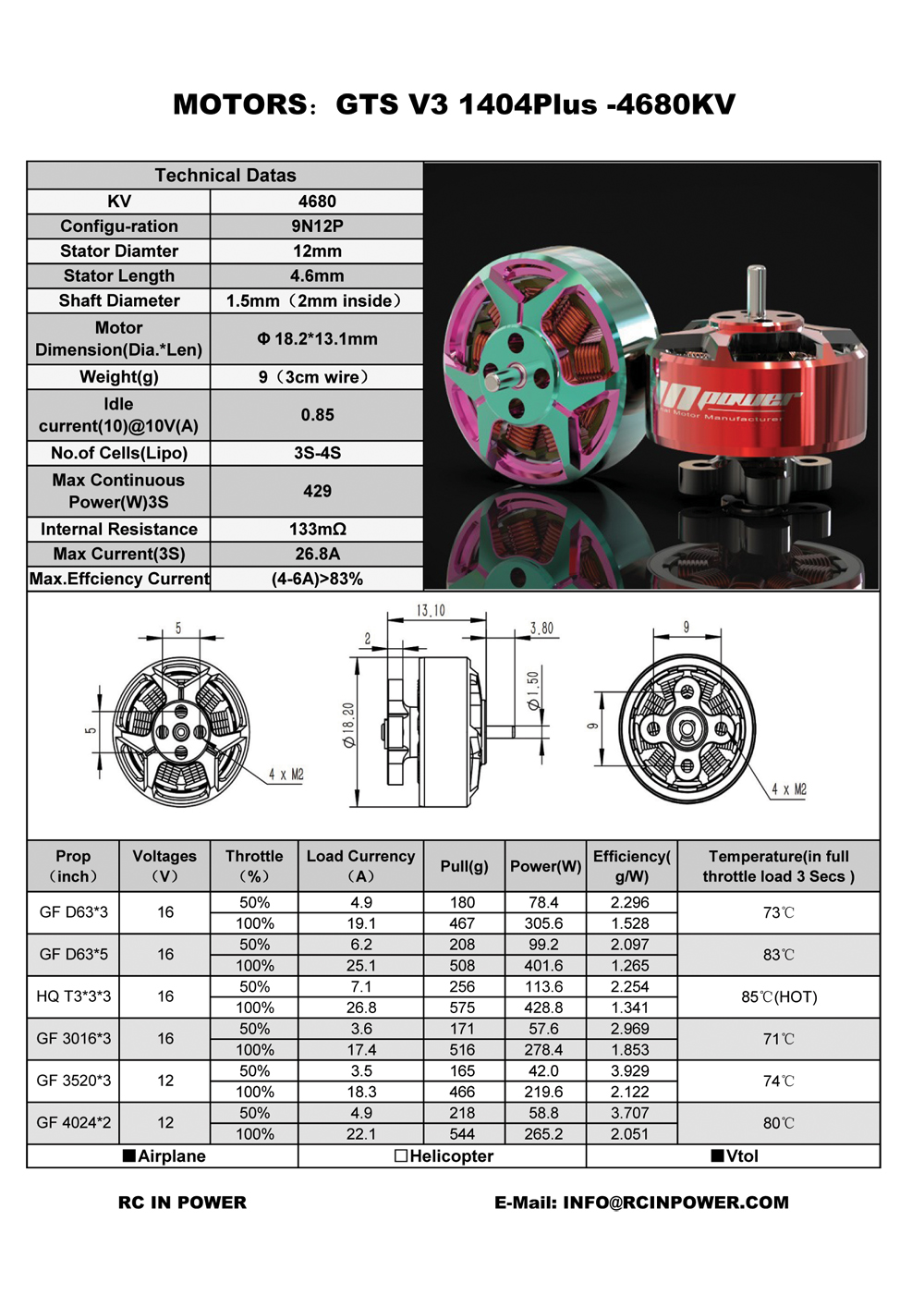 4680KV最大推力575g、出力428.8W、効率1.341g/W @100%