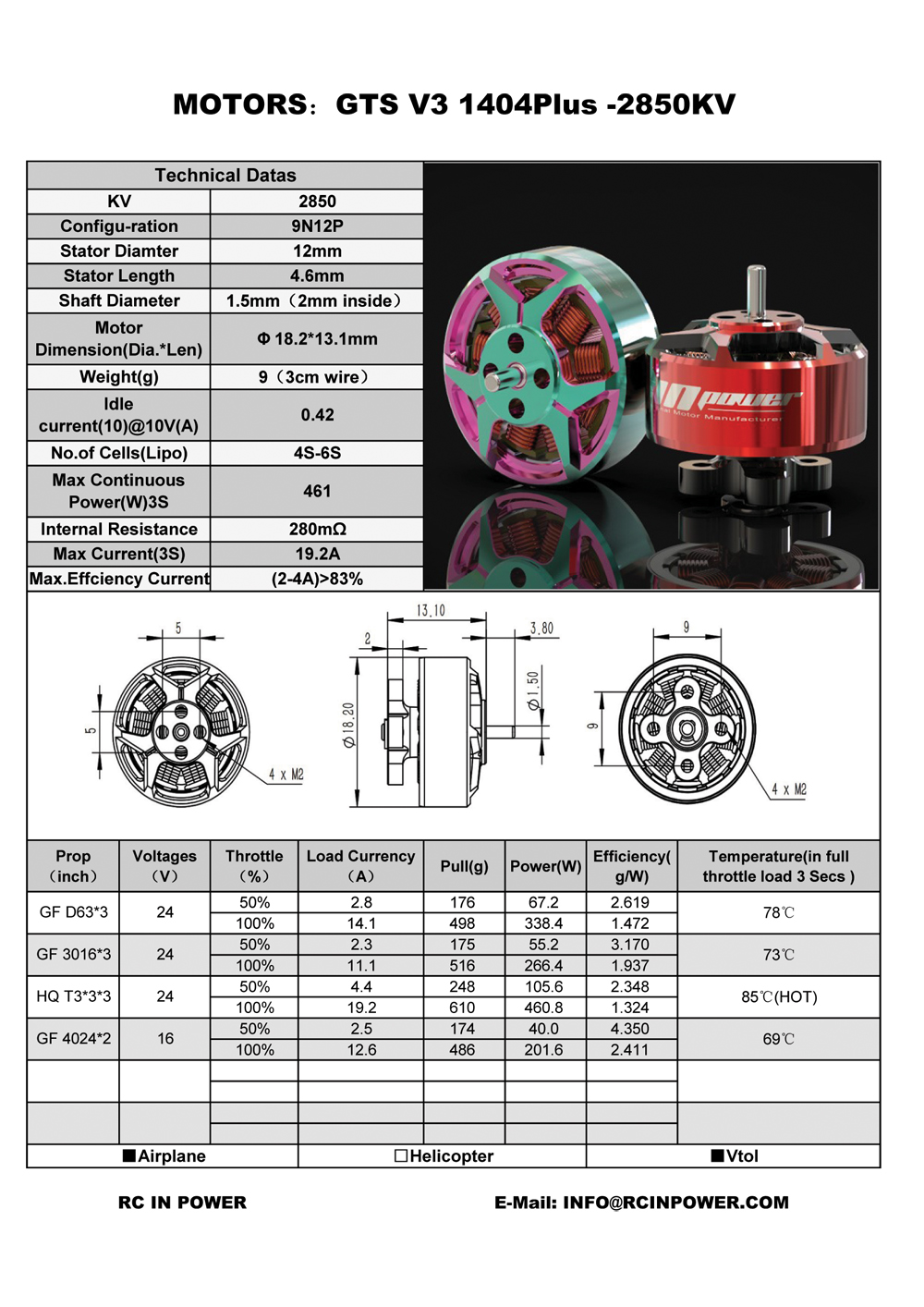 2850KV最大推力610g、出力460.8W、効率1.324g/W @100%