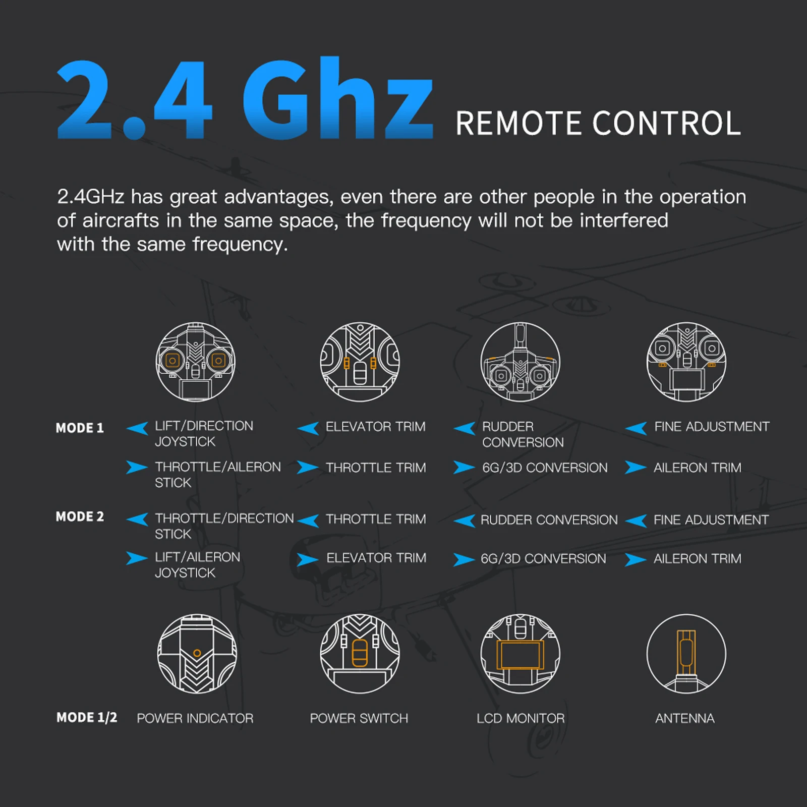 1. F-18의 스케일에 따라 4채널 디자인이 단순하고 배우기 쉽습니다. 에일러론 채널은 기체가 좌우로 회전하도록 제어하고 스로틀은 기체가 상승, 상승 및 하강하도록 제어합니다.