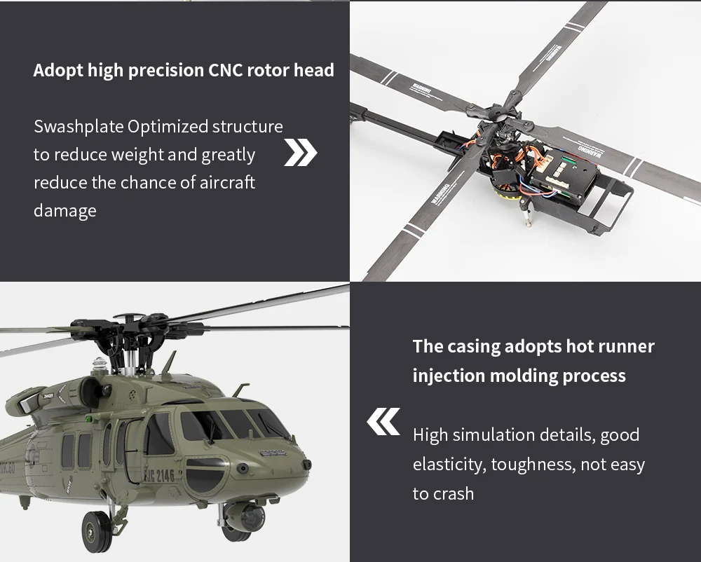 컨트롤러 배터리: 1 제어 채널: 6개 채널 색상: ArmyGreen 브랜드 이름: XYRC 사용 기간 : 14+ 항공 사진: 아니요 1. 미국 UH 60 블랙호크 헬리콥터를 47:1 비율로 축소합니다. 높은 시뮬레이션 외관 디테일, 멋진 조명, 좌우 이동식 사이드 도어 및 랜딩 기어의 충격 흡수 장치. , 비행이 더 안정적이고 구조를 최적화하며 손상 가능성을 줄입니다.
