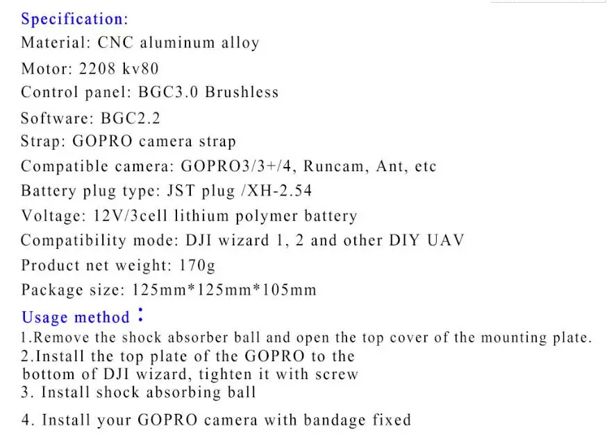 3. 짐벌을 받은 후에는 전기를 공급하지 마십시오. 먼저 GOPRO3를 놓고 짐벌에 전원이 공급되기 전에 수평을 유지하세요, 그렇지 않으면 팬 틸트, 흔들림 등이 발생할 수 있습니다.