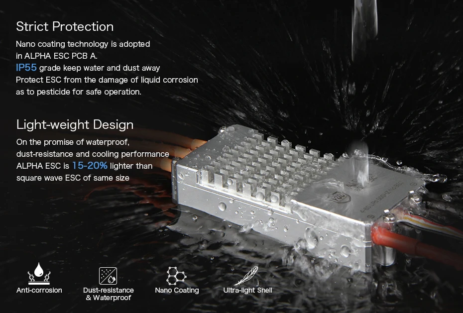 이 제품은 MNZOSS-KV125, U8II/U8lite/KV1000 및 MN801S-KV120/과 같은 모터와 호환되는 V1.2 기술을 사용하여 12S(12셀) 구성을 지원하는 ALPHA 60A ESC를 갖추고 있습니다. KV130.