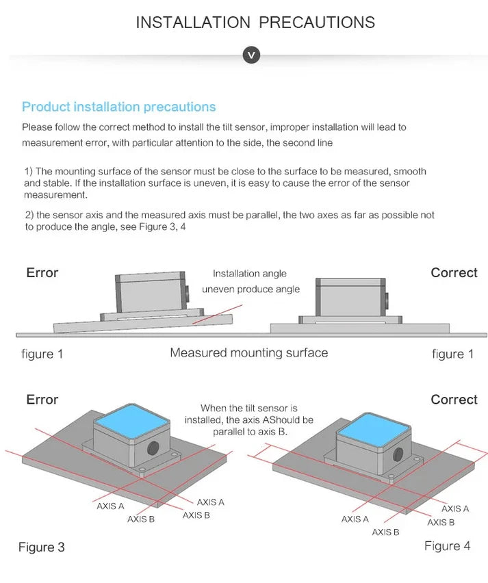 WitMotion SINVT 경사계 설치 가이드. 치수: 55×47.9×36.8 mm. 수평 및 수직 장착을 지원합니다. 좌표는 오른손 법칙을 따릅니다. 설치 표면은 지면과 평행하거나 수직이어야 합니다.
