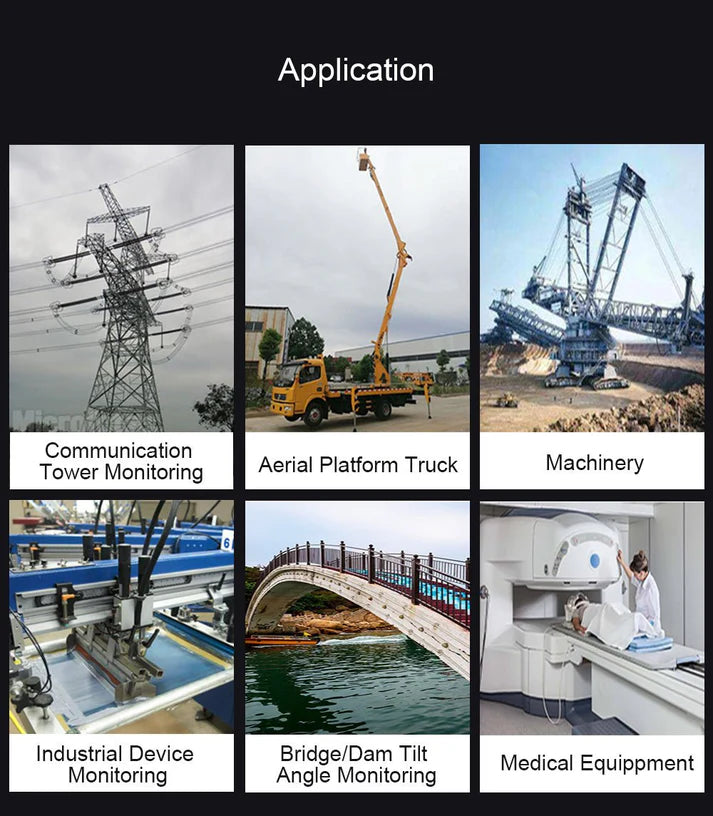 고전압 전선 타워, 교량/댐 기울기 모니터링, 유압 리프트 테이블, 광산 기계, 공중 작업 플랫폼 및 일반 산업 장비.